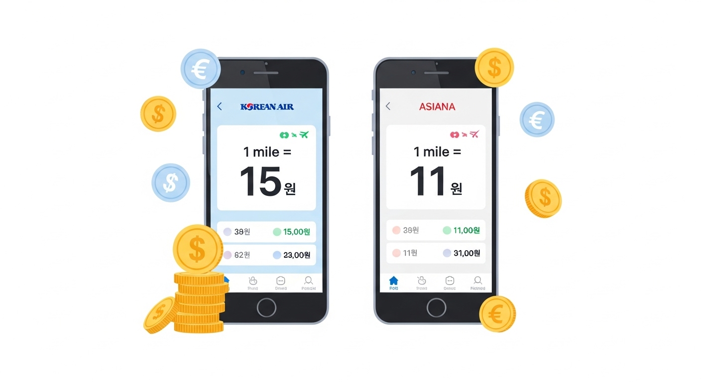 - 아시아나항공: 1마일 = 약 11~12원